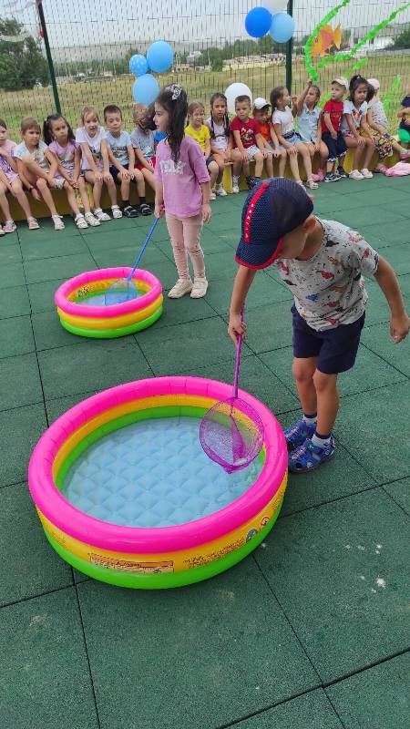 - игра "Достань жемчужину", дети ловили из воды жемчужины и складывали в свою корзинку. Игры с водой внесли в праздник ещё больше веселья, задора и смеха. Дети с интересом играли в различные аттракционы с водой.
