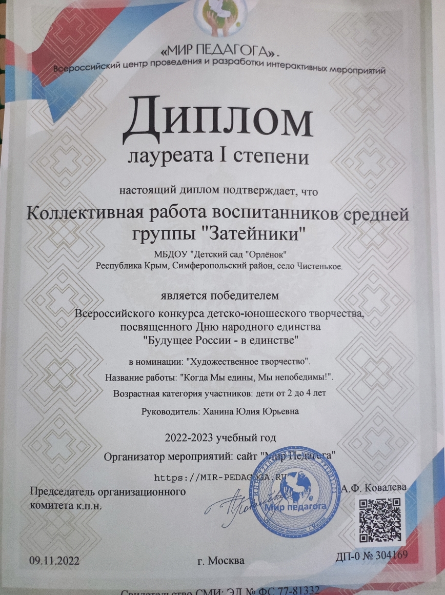 Воспитанники средней группы "Затейники" приняли участие во Всероссийском конкурсе детского творчества "Будущее России — в единстве" и завоевали диплом лауреата I степени. Молодцы!!