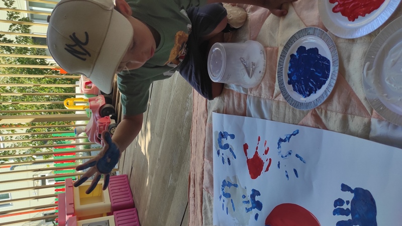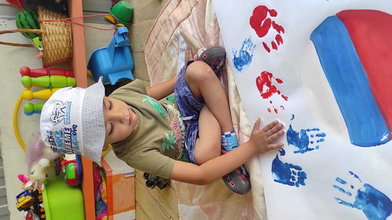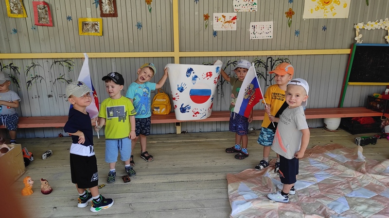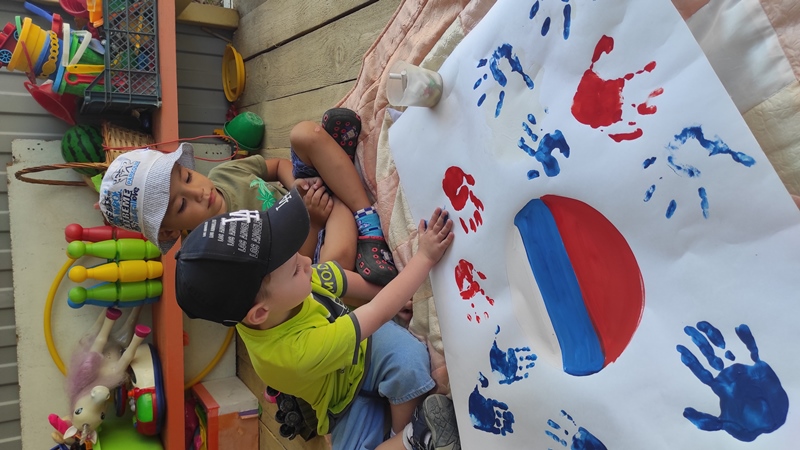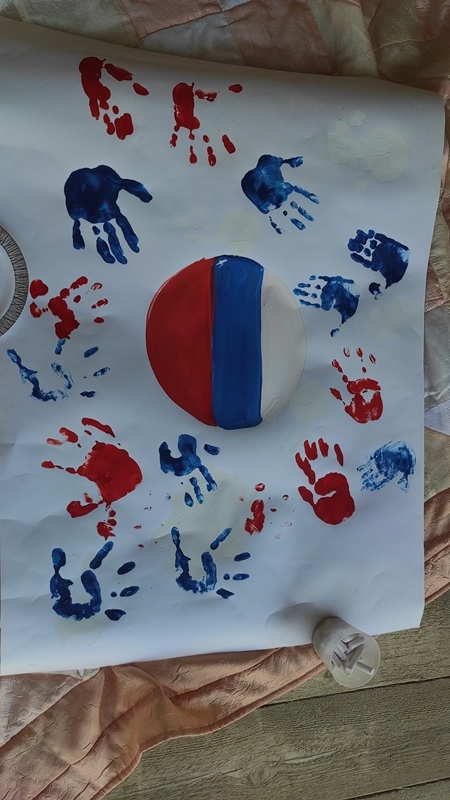 Ну и конечно, какой же "день рождения" без открытки. Мы с ребятами изготовили коллективную открытку "С днем Российского флага" с помощью красок и наших ладошек!