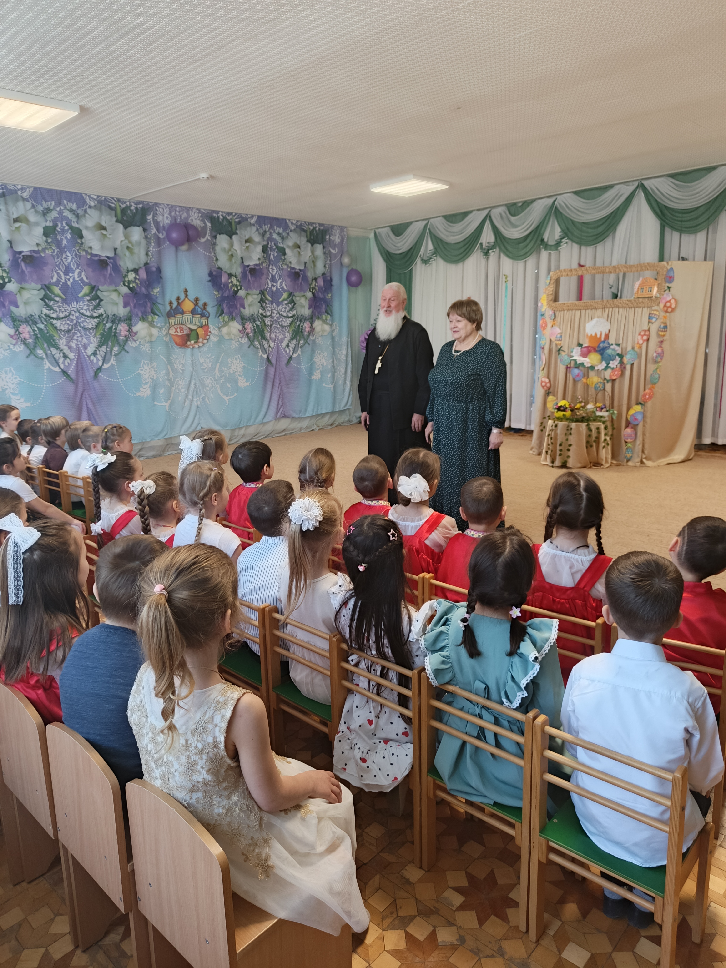 Старший воспитатель и музыкальный руководитель подготовили и провели замечательное развлечение «Светлая Пасха». В гости к детям приходил иерей Владимир Вербицкий , настоятель Храма Успения Пресвятой Богородицы нашего села, который сообщил детям, что это христианский и самый значительный православный праздник.